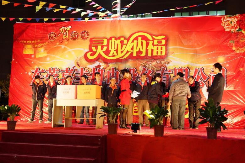 2013年元月19日晚上,東莞嘉豐公司全體員工在公司籃球場舉行了一場盛大的晚會,公司吳常董也欣然參加了晚會。
